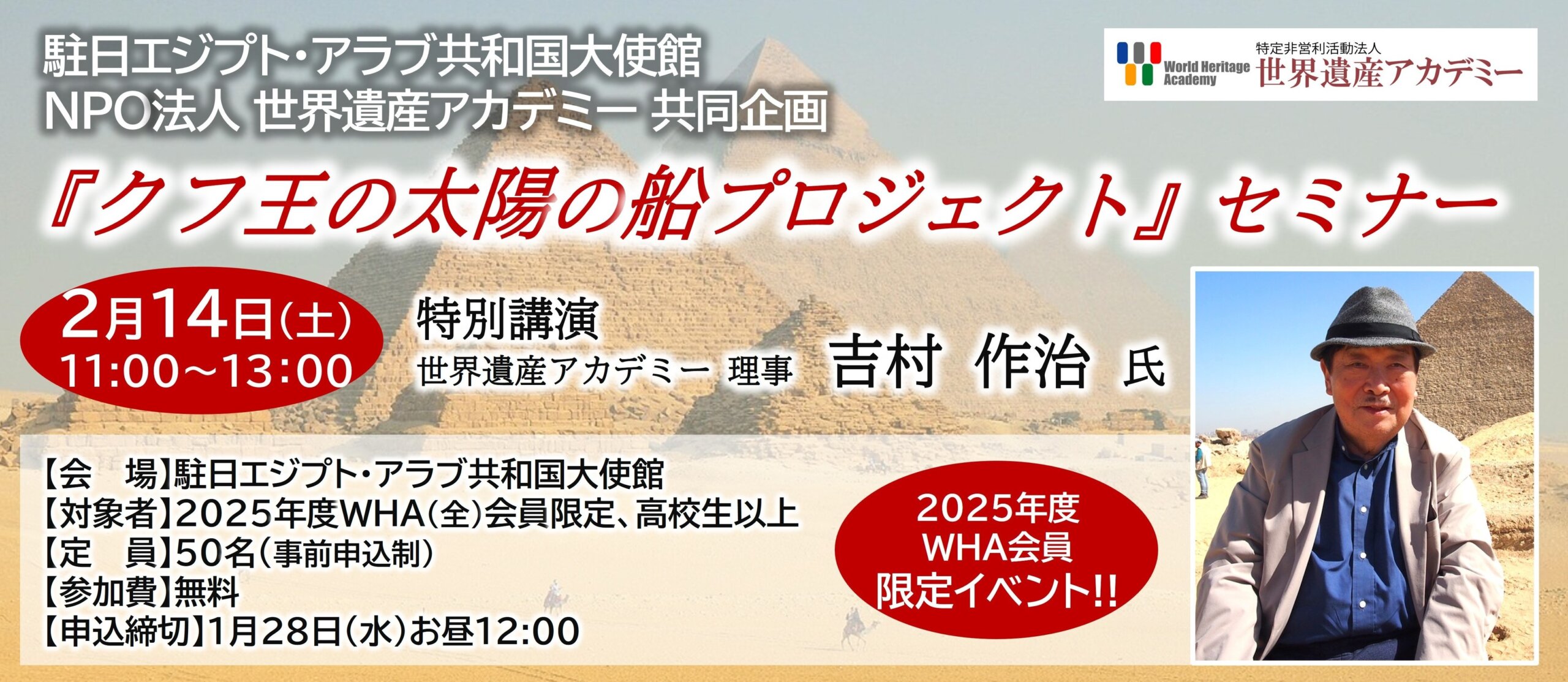 2026年2月14日(土)開催、エジプト大使館/WHA共同企画『クフ王の太陽の船プロジェクト』セミナー