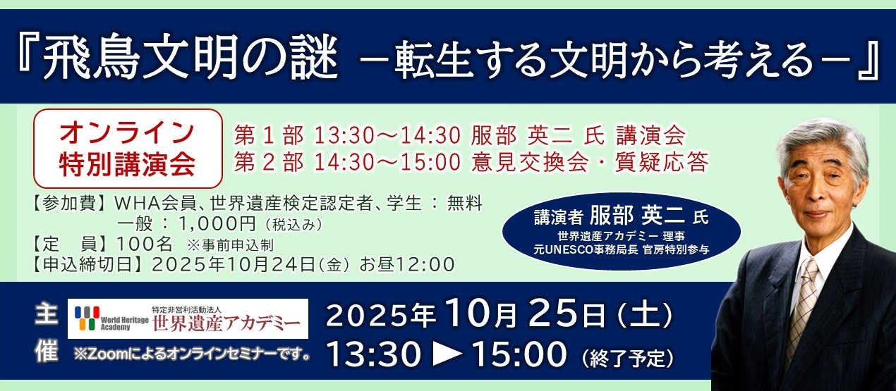 2025年10月25日(土)開催、WHA主催、WHA理事・服部 英二 氏による、オンライン特別講演会『飛鳥文明の謎 -転生する文明から考える-』のご案内