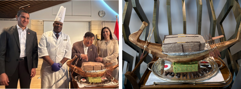 セミナーの最後には、エルエトレビ大使閣下より、2月1日(日)に83歳のお誕生日を迎えられた吉村 氏へ「クフ王の太陽の船」をかたどった特製バースデーケーキが贈られるという、心温まるサプライズもありました。会場は祝福の拍手に包まれ、参加者全員でお誕生日をお祝いし、吉村氏の今後のさらなるご活躍にエールをお送りしました。
